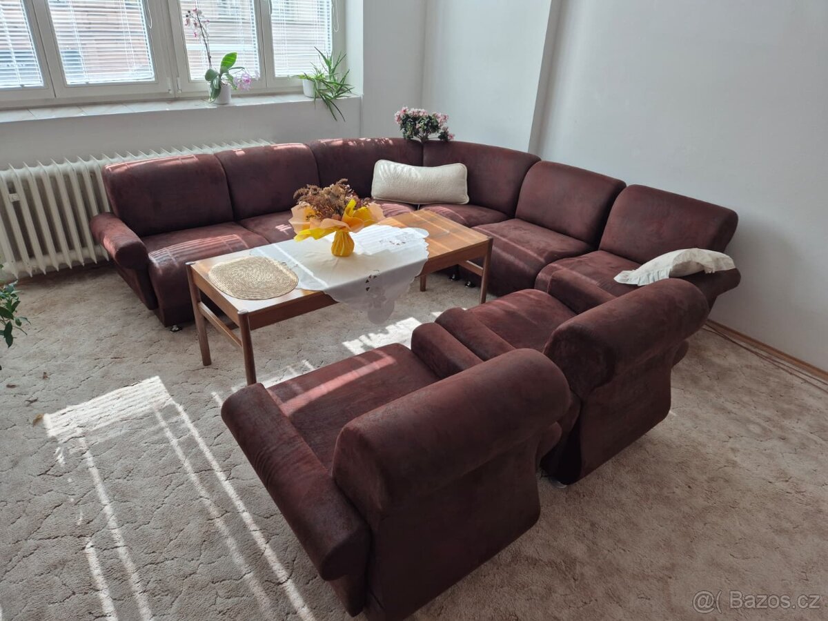 Prodám nově potaženou čokoládovou rohovou sedačku ( asi 3 roky) se dvěma křesly. Rohová část je složena ze šesti samostatných částí, takže je snadno mobilní, dobře se pod ní tedy i uklízí. Díly se dají dole jednoduše spojit kovovou úchytkou. K odběru ihned v blízkosti I.P.Pavlova v Praze.