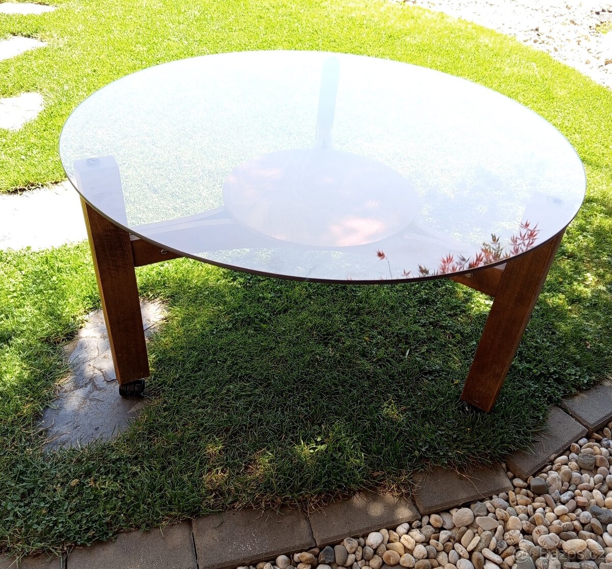 Dreveny stolek se sklem. Ma pojizdne kolecka. Prumer 90 cm.