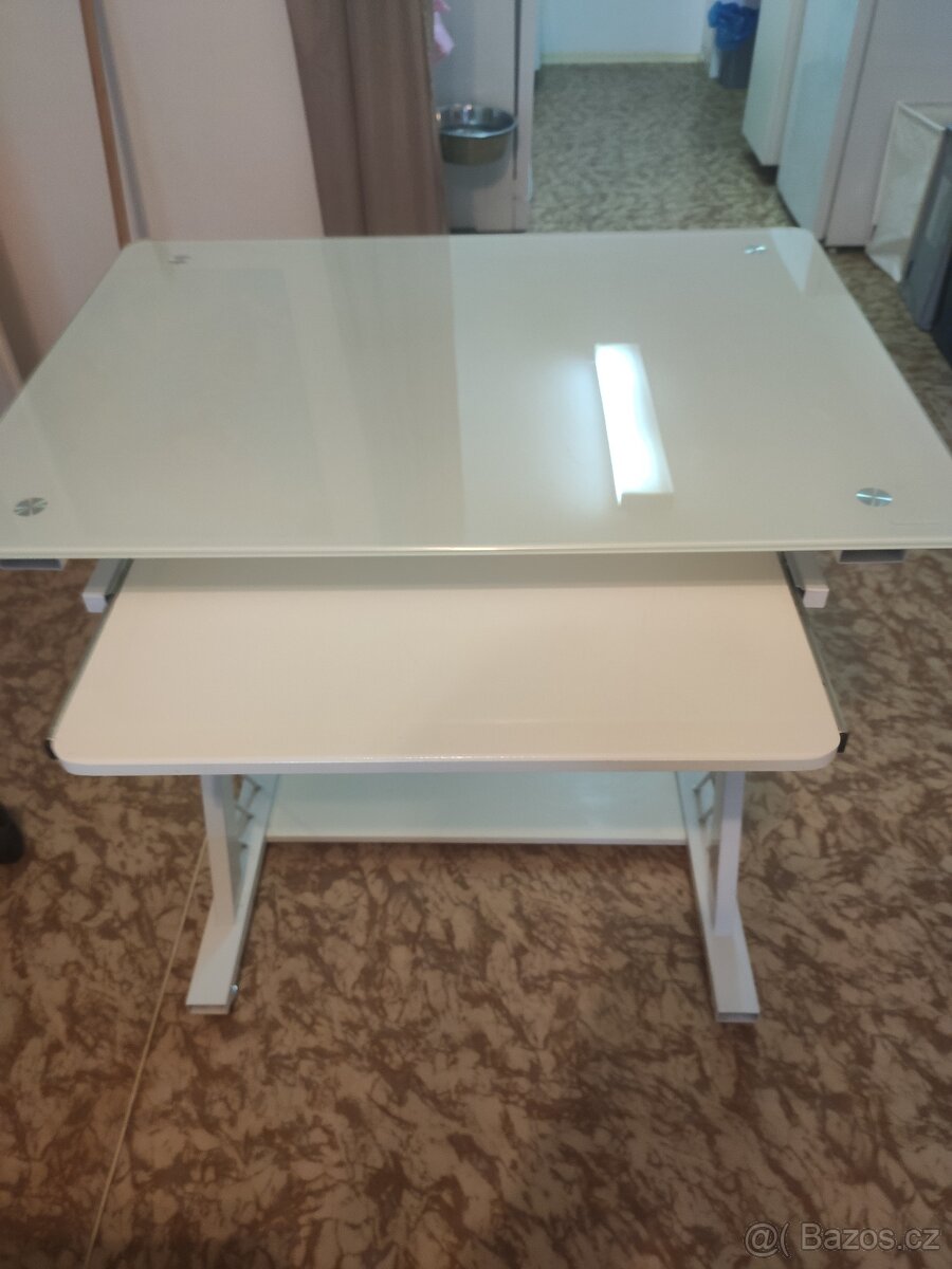 Prosklený počítačový stůl 80x60 cm s vysouvacím mechanismem na klávesnici.