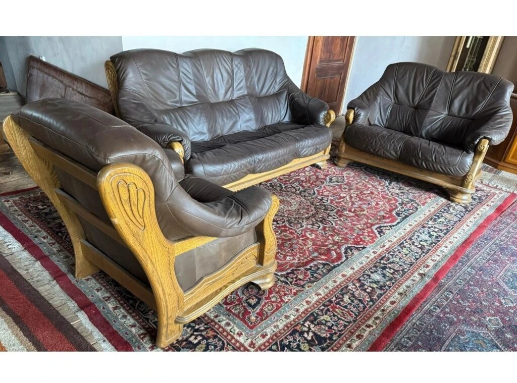 Sedačka je v kombinaci hnědé barvy se světlým dřevem.