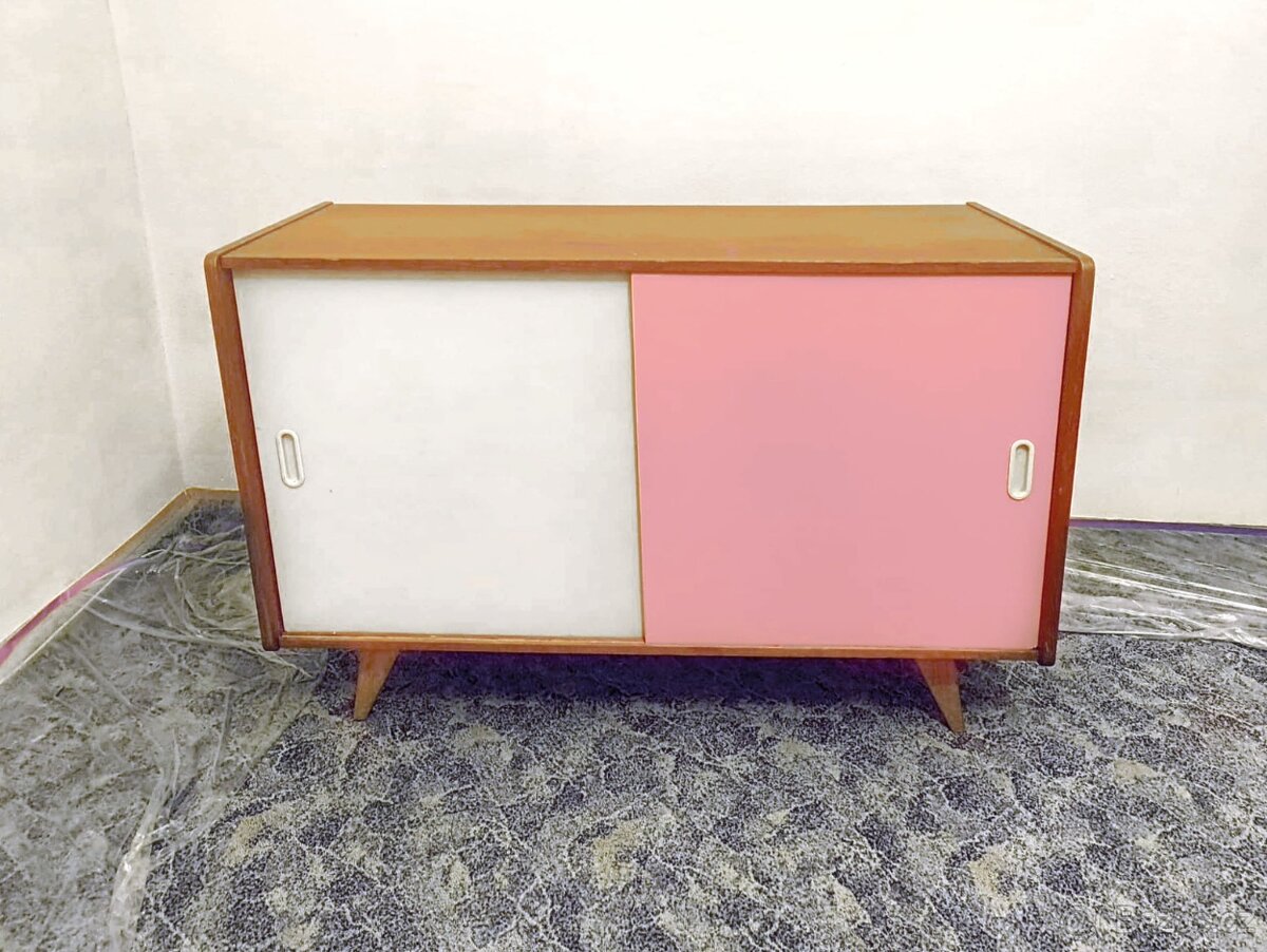 Nabízím vyhledávaný sběratelský kus českého designu v bruselském stylu – retro skříňku navrženou Jiřím Jiroutkem pro Interiér Praha (design 60.let). Jedná se o nadčasový kus, který skvěle zapadne do moderního i vintage interiéru. Skříňka je vyrobena v typickém stylu Jiroutkovy tvorby – jednoduché linie, elegantní proporce a kvalitní řemeslné zpracování. Vhodná jako úložný prostor do obývacího pokoje, pracovny nebo ložnice. Stav zachovalý, posuvné dvířka v růžovo šedé barvě, uvnitř jedna police (viz foto). Rozměry – výška 75,5 cm (59 cm pouze skříňka bez nožiček), šířka 110 cm, hloubka 45 cm. Pouze osobní odběr ve Zlíně.