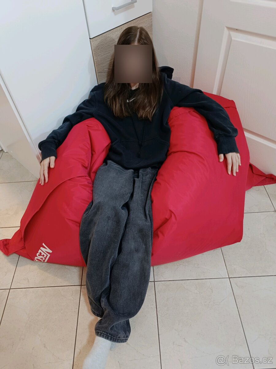Velikost cca 180cm x 140cm. Je na něm pár menších fleků (viz foto). Zároveň je vak možno složit do podoby různých sedacích minigaučů (například viz foto).