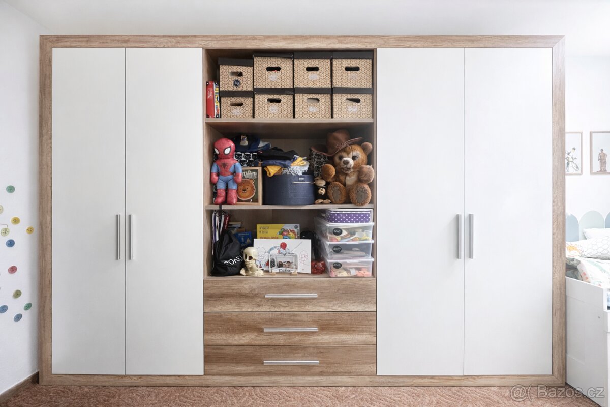 Moderní kombinace dekoru dřeva a bílé barvy, vhodná do ložnice i dětského pokoje. Skříň nabízí opravdu hodně úložného prostoru.