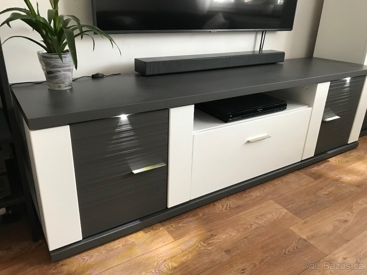 Prodám novou komodu Caracas. Barva grafit a bílá lesk. Délka 215cm, výška 60cm, hloubka 51cm, tloušťka vrchní desky 4cm. Bodové led osvětlení. Kvalitní, pevná komoda.