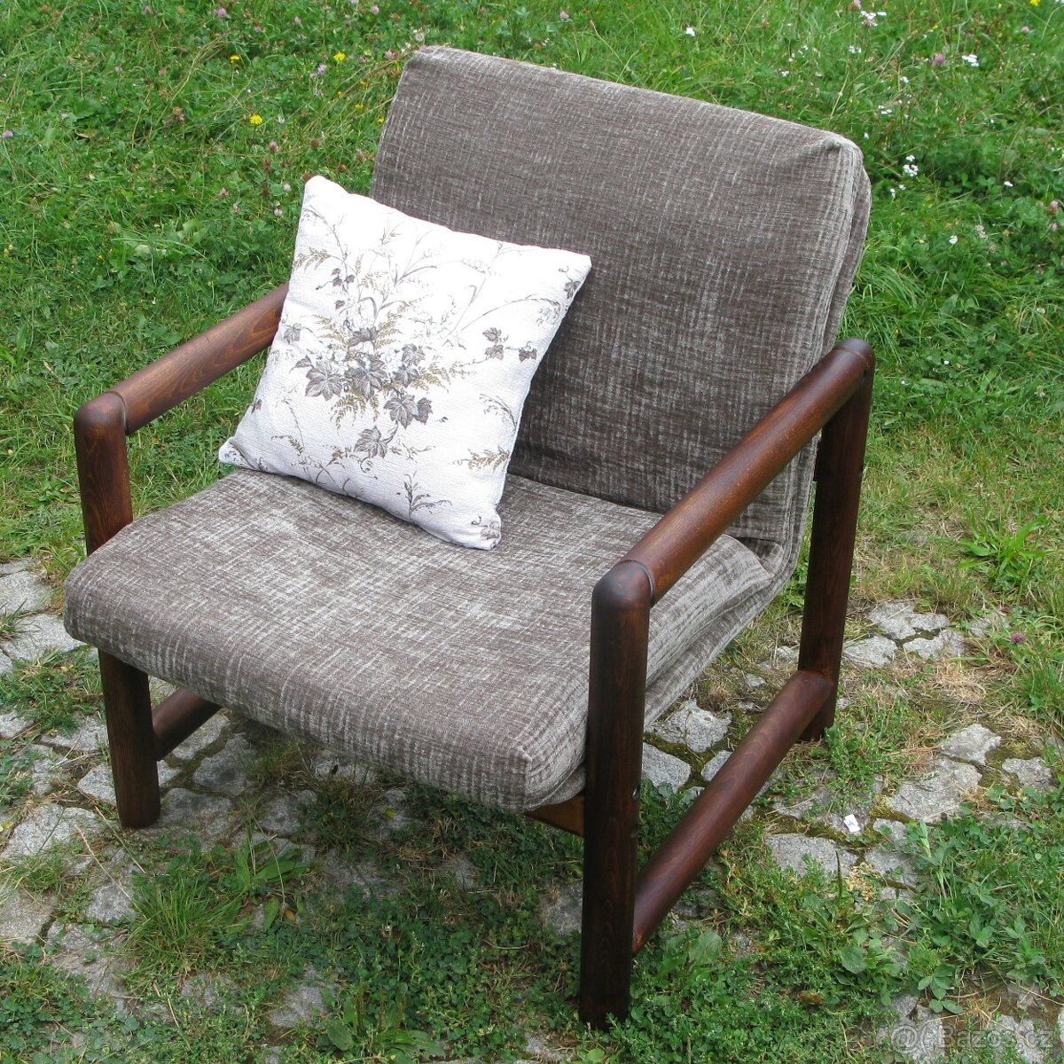 Křeslo je pohodlné, pevné, ve výborném technickém stavu, z tvrdého dřeva, které není nijak poškozené, jeho povrh je přebroušený, namořený a ošetřený olejem s tvrdým voskem. Nový potah je z vrchních polštářů snímatelný. Šířka křesla 65 cm, hloubka 73 cm Pouze osobní převzetí. Komunikace přes web Bazoš.
