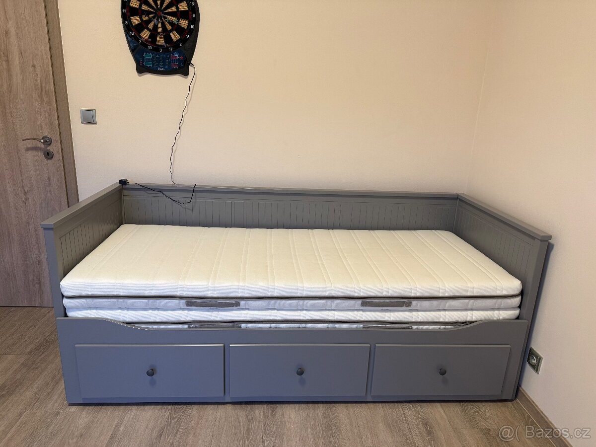 Prodám krásnou a praktickou rozkládací šedou postel IKEA HEMNES vč. roštů a 2 matrací IKEA Malvik. Pratelné potahy matrací. Postel z hostinského pokoje, využívána minimálně.