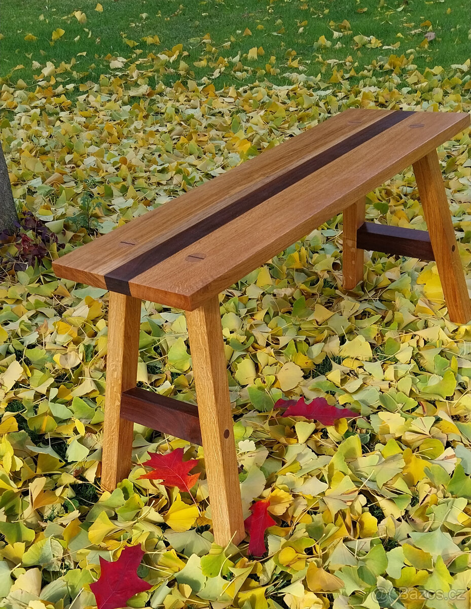 Nová dubová lavička kombinovaná z orechovým drevom. Na bežné používanie. V tomto vyhotovení je to jedinečný kus kvalitného nábytku.