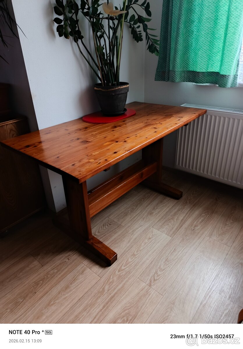 Prodám bytelný selský stůl z masivu. Rozměr 130-70-73, délka-šířka-výška, tloušťka desky 2,5 cm. Bez šroubů, hřebů, spoje - precizní řemeslná práce, vysoká nosnost.