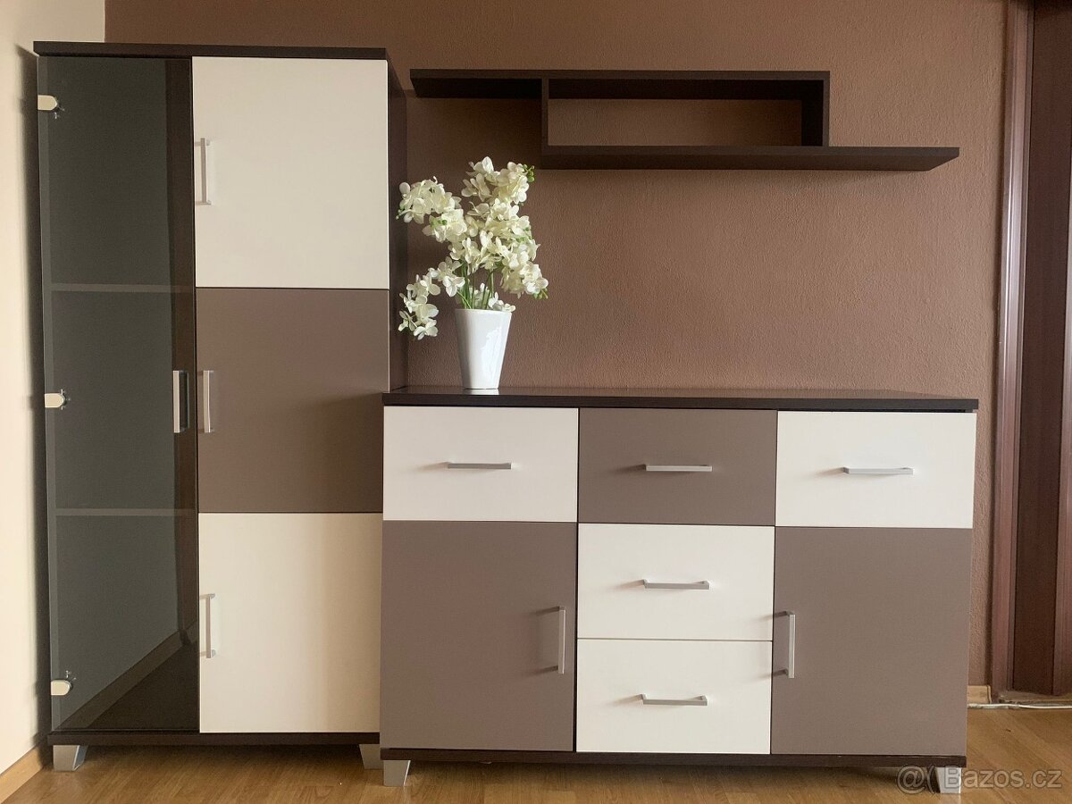 Obývací stěna + konferenční stolek - [15.2. 2026]Prodám obývací stěnu (skříňka s policí, TV stolek, prosklená skříňka, konferenční stolek). Při rychlém jednání sleva.