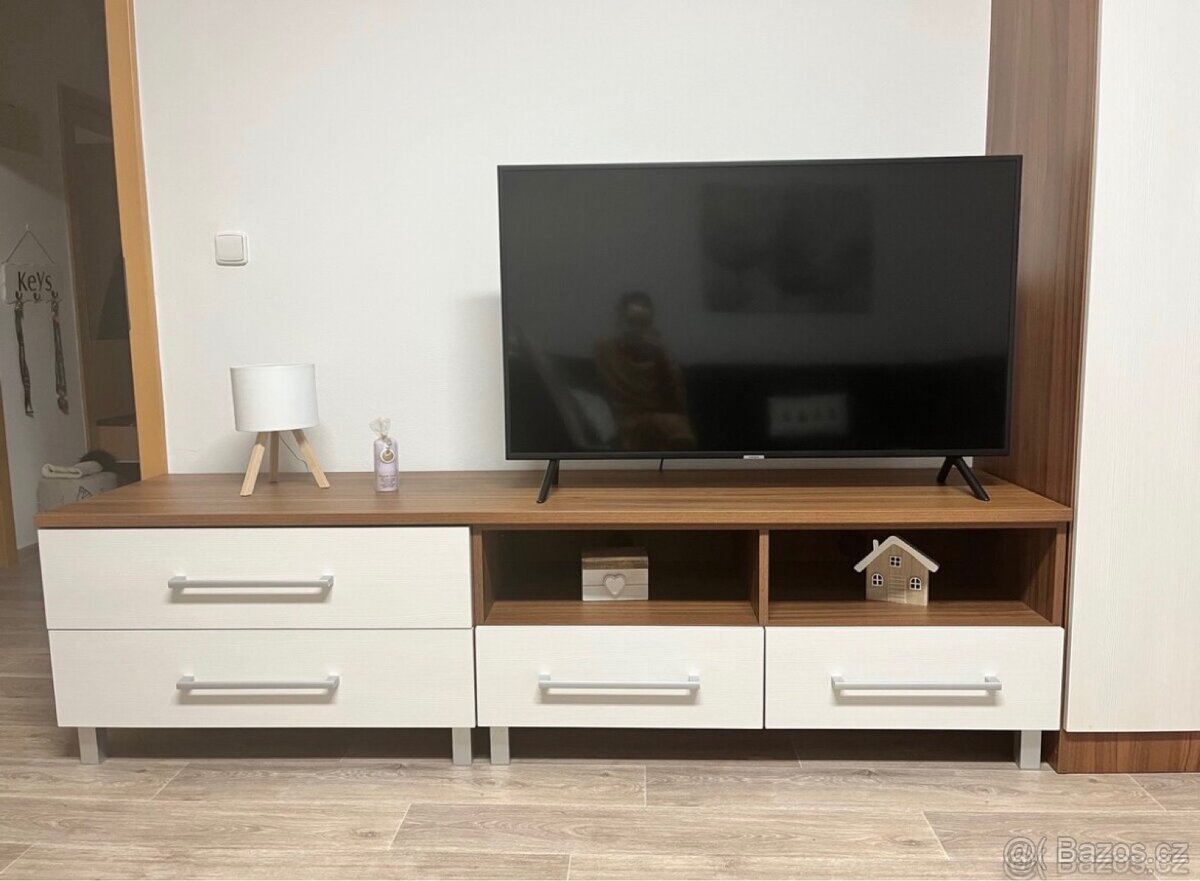 Prodám hned 2 kusy obyvákového nábytku v ořechové barvě se smetanovými čelními dvířky a stříbrnými úchytkami.