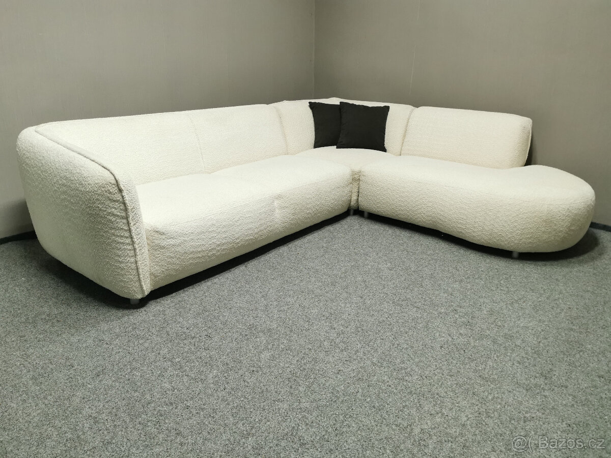 Nové (vystavený kus). Potah látka, celočalouněné. Značka SOHO. Nerozkládací, včetně polštářků. Zprava: 230 x 273 cm, výška 73 cm, výška sedáku: 43 cm, hloubka sedáku: 60 cm. Doprava je možná.