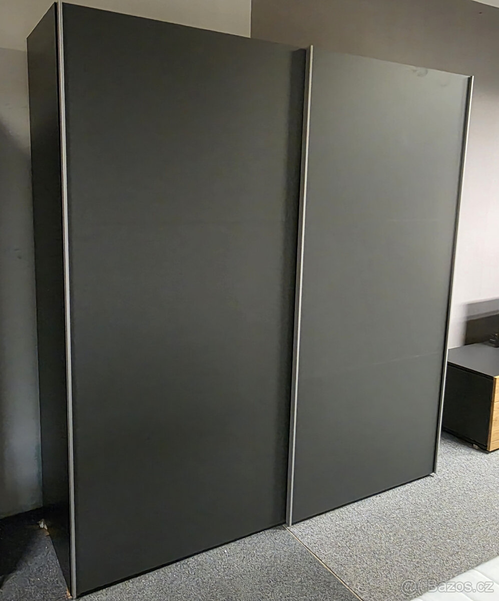 Nová zrcadlová zašupovací skříň 2 dveře šedočerná - [15.2. 2026]Materiál vysoce kvalitní 20 mm silné lamino. Kování HETTICH. Délka 203 cm, hloubka 65 cm, výška 220 cm. Doprava je možná.