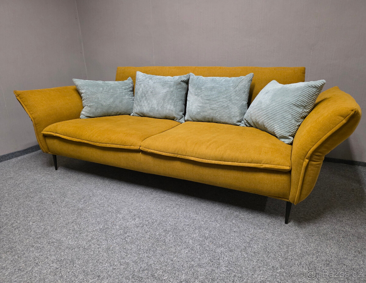 Zánovní (oděrky vzadu viz foto, horší spodní látka). Německá značka Henders & Hazel. Nerozkládací, polohovací opěrky rukou. Cena s polštáři. Délka 245 cm, hloubka 107 cm, výška 87 cm, výška sedáku: 45 cm, hloubka sedáku: 60-90 cm, délka sedáku: 188 cm, výška nohou: 17 cm. Doprava je možná.