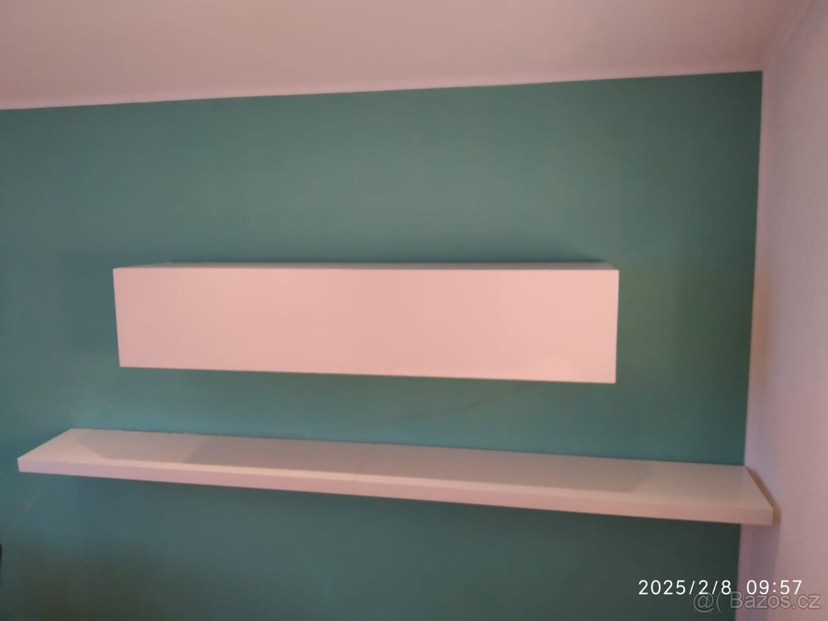Prodám televizní stolek/skříňku - [2.2. 2026]Prodám závěsný televizní stolek v bílém lesku, bez vad! Lze i podsvítit, jako je vidět na druhé fotce s bílo-černým stolkem.