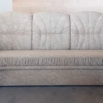 Třímístný s funkcí lůžka. Záda potažena originální látkou. Potahový materiál z mikroveluru (100% polyester). Na pevných plastových kluzácích. Rozměry: výška sedáku 45 cm, hloubka sedu 54 cm. Trojmístná lehací plocha 120x175 cm