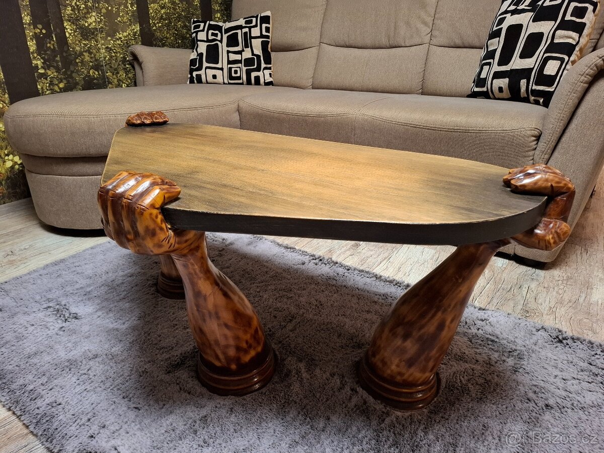 Prodám nový ručně řezaný konferenční stolek.Nohy lípa deska borovice.Rozměry: d100cm x š53cm x v47cm. Více na tel 731480279