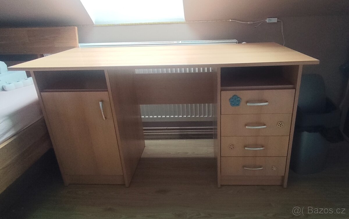Prodám psací stůl,na pravé straně má čtyři šuplíky a v levo skříňku s policemi. Je plně funkční. Rozměry: š 136cm.hl:60cm. v:75.cm.Pouze osobní odběr.