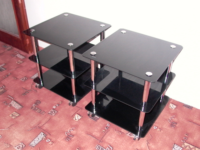 Dva pěkné pojízdné konferenční stolky s brzdičkami, chromové + skleněné černé police, rozměr každé police 44 cm x 44 cm, výška stolku 48 cm. Cena za každý 500,- Kč.