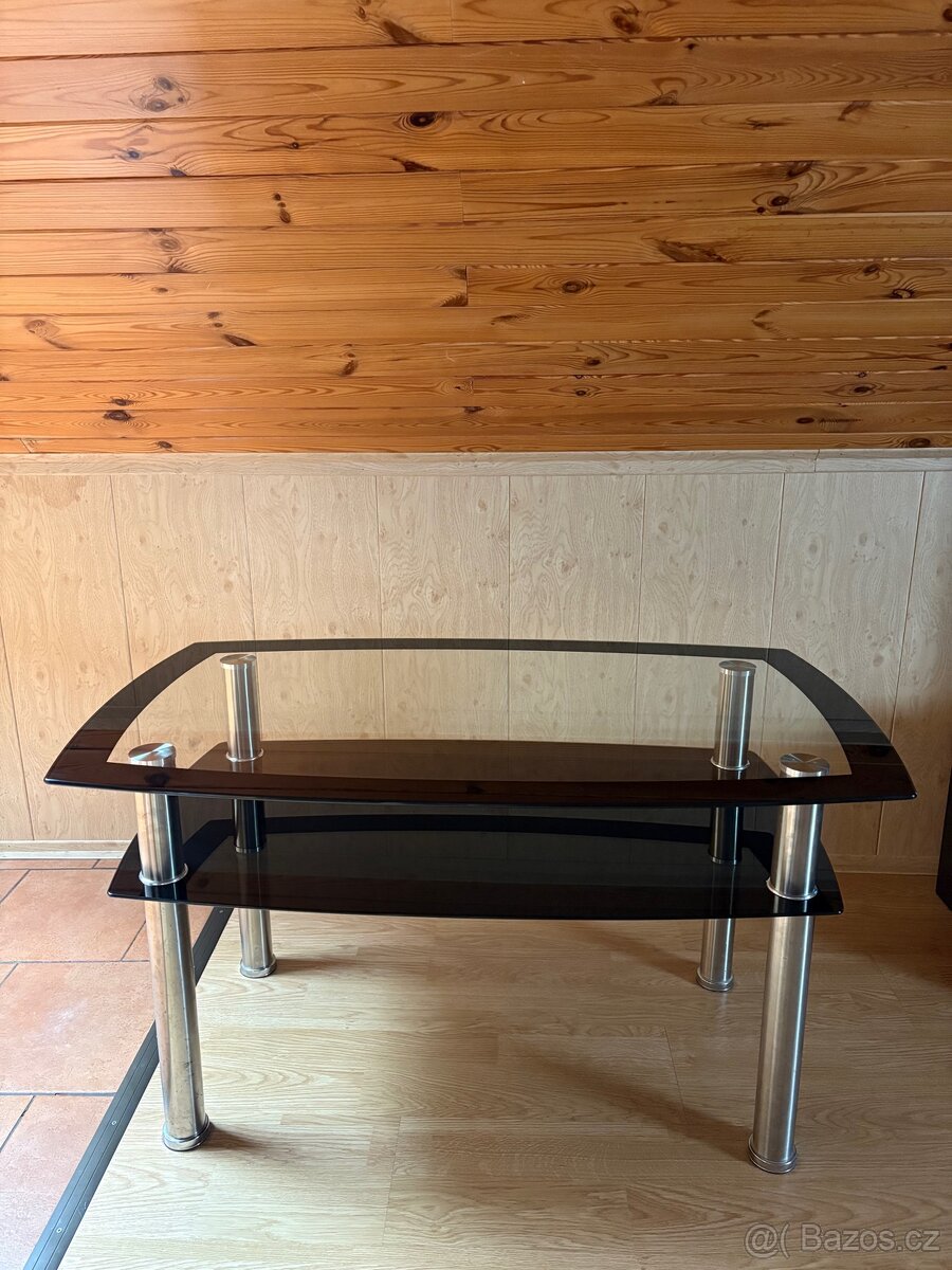 Nabízím k prodeji velmi pěkný a zachovalý konferenční stolek. Horní deska je z čirého skla, spodní odkládací plocha je z elegantního černého skla. Nohy jsou kovové.
