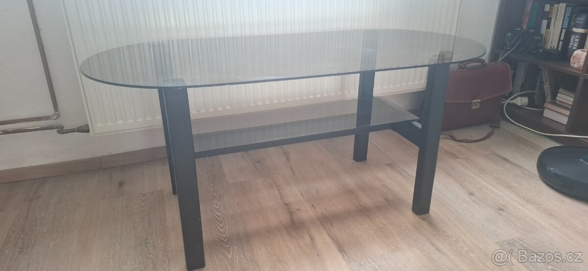 Zachovalý konferenční stolek v dobrém stavu, materiál dřevo + sklo. Rozměry 116x54x52