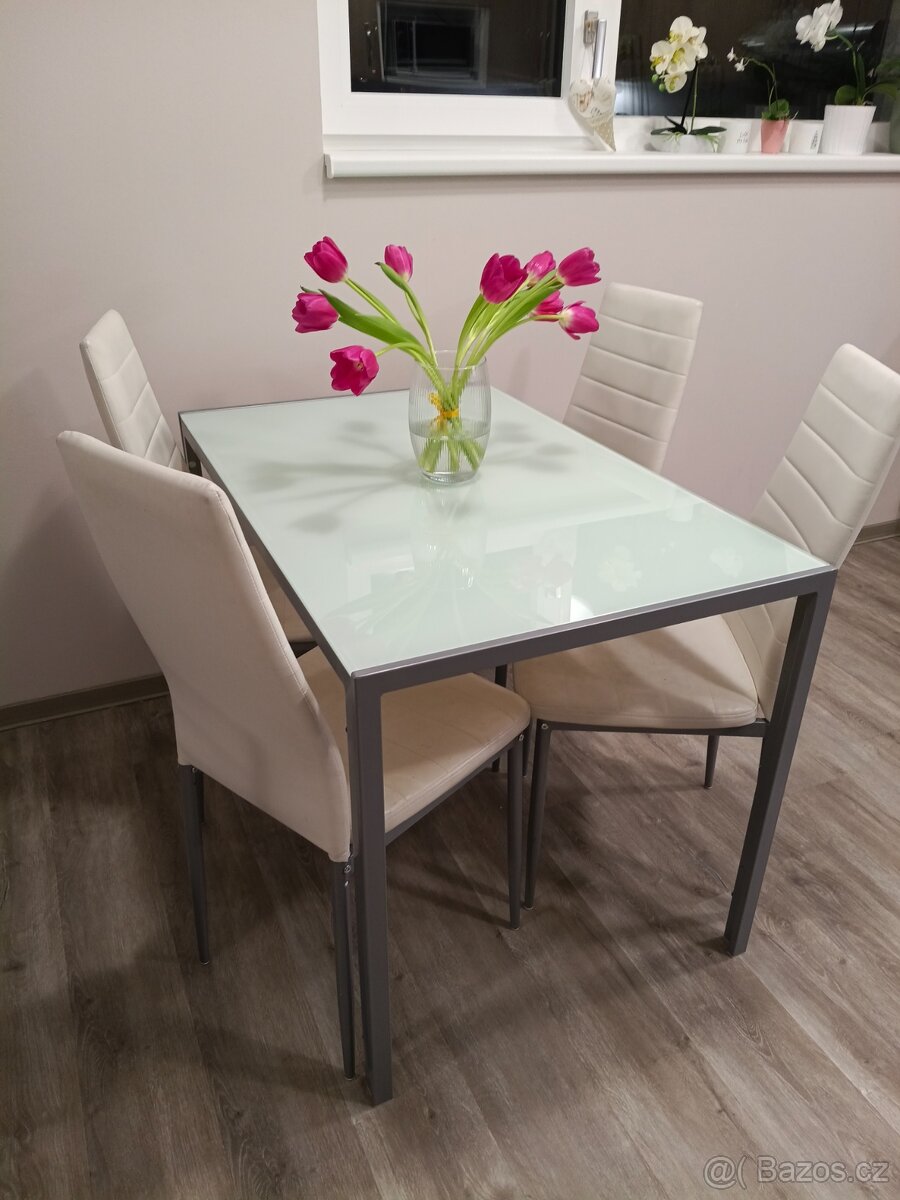 Prodám pěkný stůl s mléčným sklem a s kovovou konstrukcí se čtyřmi židlemi z ekokůže. Stůl je zánovní a židle s drobným poškozením.