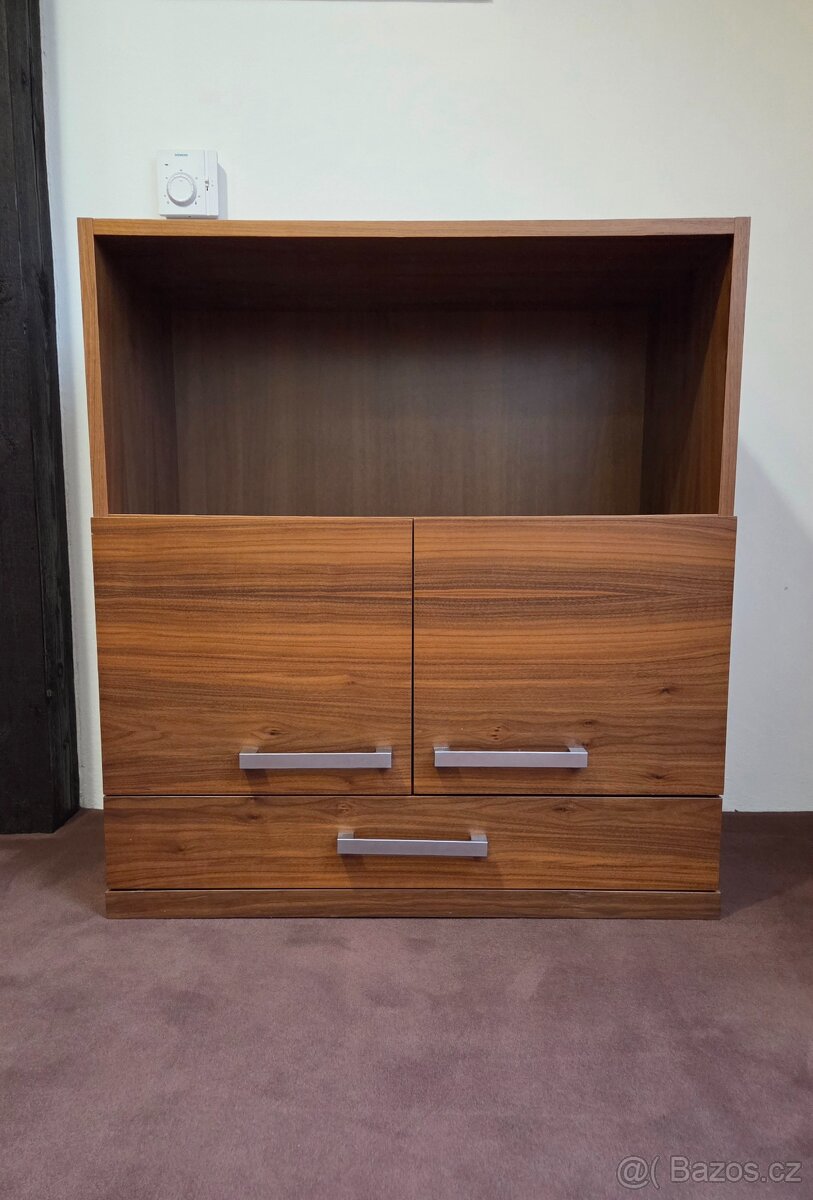 Nabízím k prodeji dvoudílnou skříň, vyrobenou na míru z dýhované dřevotřísky, odstín ořech, lakováno dvousložkovým lakem Icla semimat.