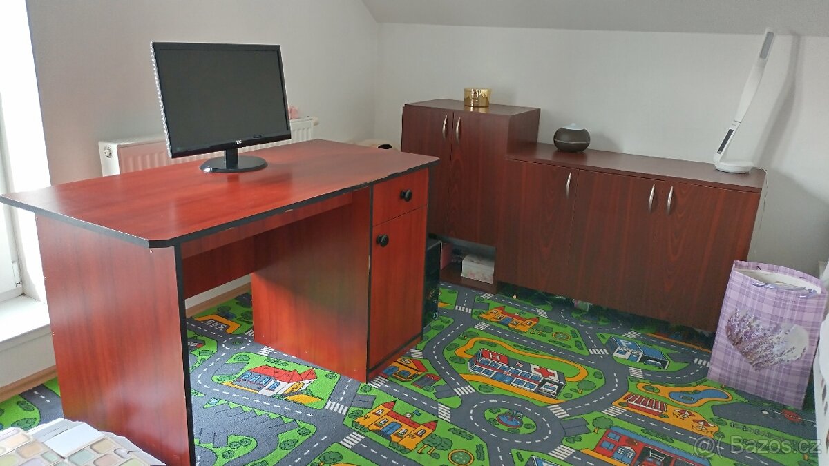 Sestava skříní a psacího stolu do pracovny nebo dětského pokoje v dekoru mahagon. Skříně v podstatě ve výborném stavu, pouze stůl nese známky používání v hranách (viz foto), lze vyřešit přehraněním. Rozměry skříní od nejnižší po nejvyšší (š/h/v, cm): 100x40x70, 55x40x86, 66x40x210, 55x40x160. Velká a malá skříň o šířce 55 stály původně na sobě jako jedna vysoká skříň, lze ale postavit i samostatně viz foto. Stůl délka 125, hloubka 60, výška pracovní plochy 75 cm. Pouze osobní odběr s vlastním odvozem.