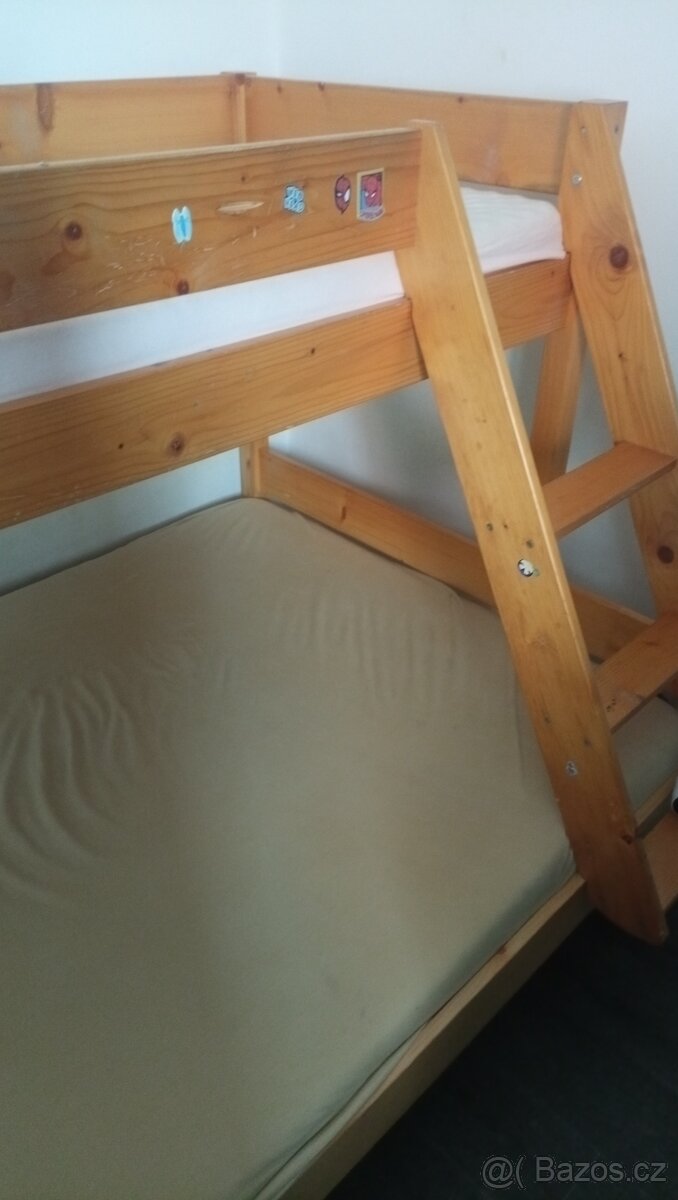 Dřevěná poschoďová postel - [2.1. 2026]Prodám kvalitní bukovou poschoďovou postel na matrace 90*200 cm (zdarma jedna matrace) v dobrém stavu viz obrázky. K odvozu rozložená a zabalená.