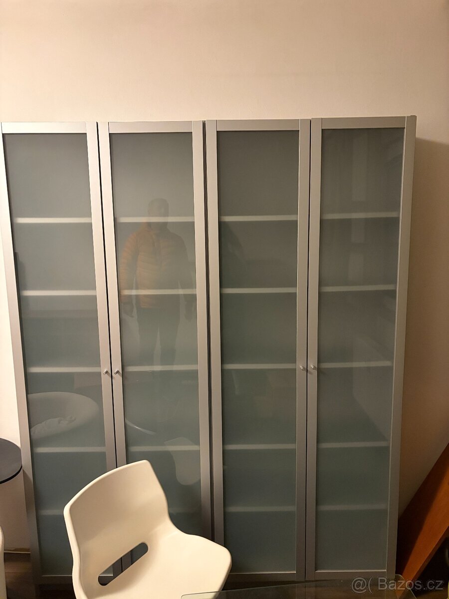 Prodám 2 kusy knihovny BILLY z IKEA, barva "stříbrná" - šedá, mléčné sklo. Rozměry jednoho kusu 202x80x30cm.