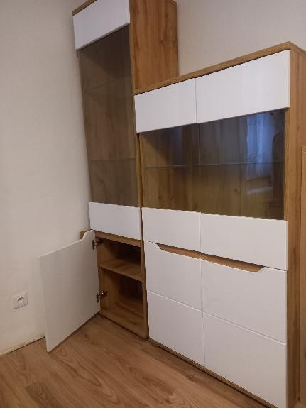 Prodám skříń. sestavu : Skříňka - vitrina v/š/h 145/80/40 cm ( 4800,-), nízká skříňka v 48/ š134/ h45 cm ( 4800,-), vitrína 196/50/40 cm (5000,-) .Barva bílá(lesk)/ dub . Police sklo/ dřevo. Stav výborný ( na dvířkách je ještě ochranná folie ) . Možno i jednotlivě .