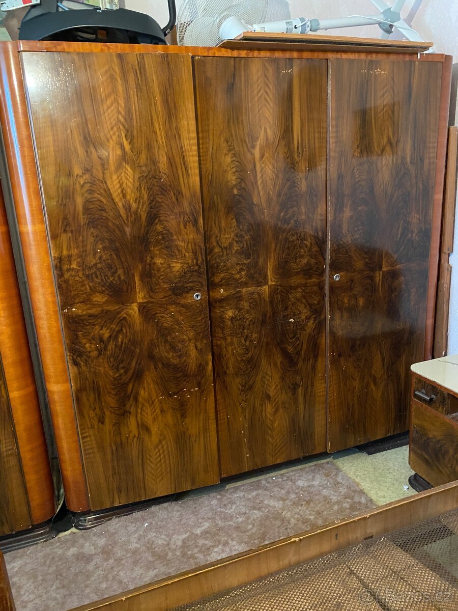Prodám krásnou ložnici z období art deco s výraznou ořechovou dýhou. Sestava: 3x skříň, manželská postel, 2× noční stolek.