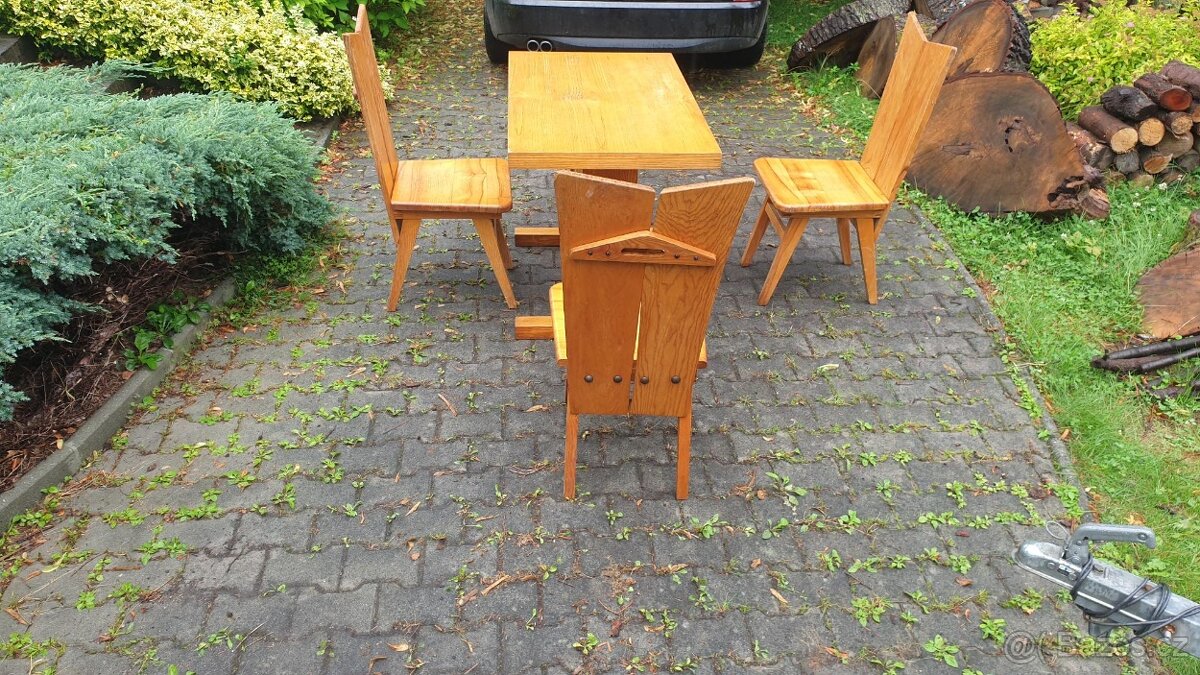 Prodám stůl a tři židle masiv, borovice viz foto. Domácí výroba.