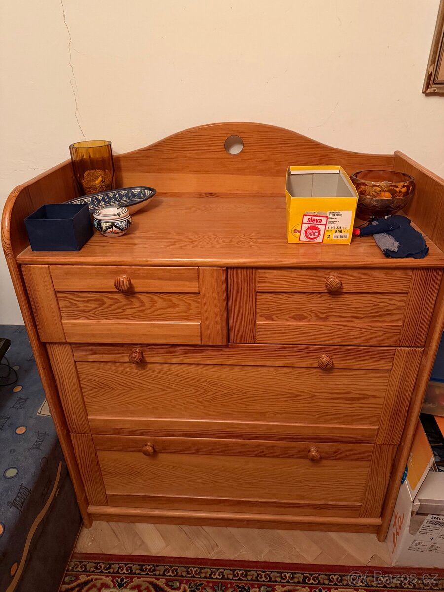 Čtyřzásuvková komoda, přírodní dřevo, velmi zachovalá. Ideální do ložnice nebo dětského pokoje.