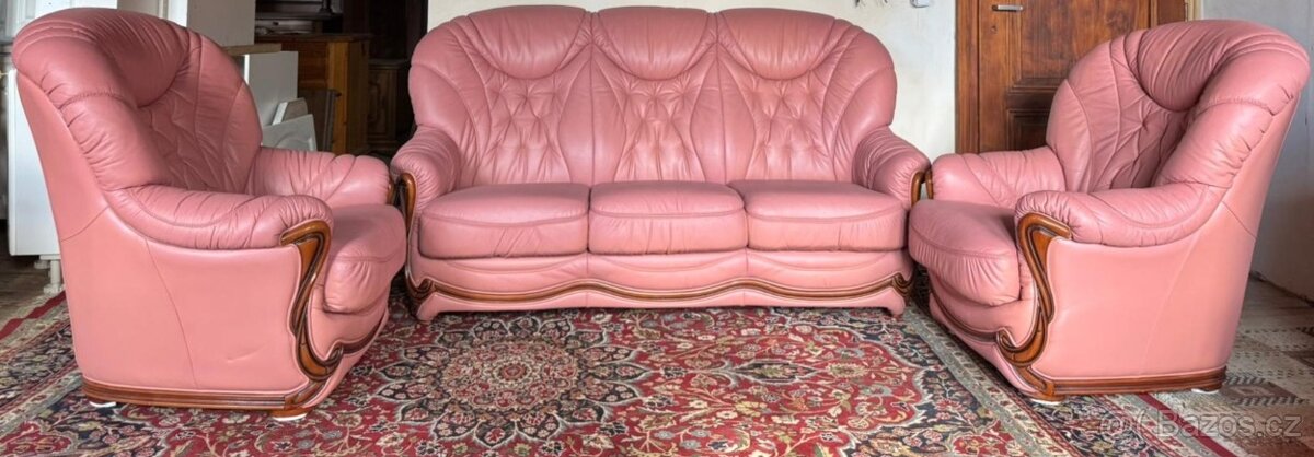 Prodám luxusní italskou koženou sedací soupravu sestávající z trojsedáku a 2 křesel ve starorůžové barvě.