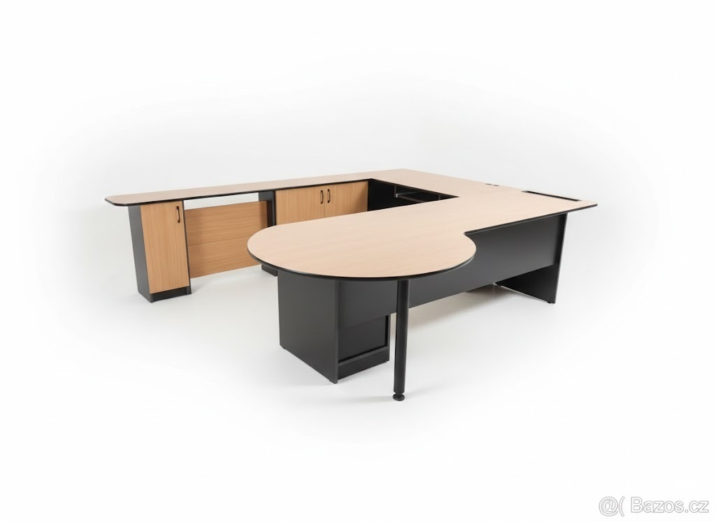 Prodám prostorný rohový kancelářský stůl ve tvaru U s velkou pracovní plochou a integrovanými úložnými prostory (skříňky a šuplíky). Provedení v dekoru světlého dřeva v kombinaci s černou.