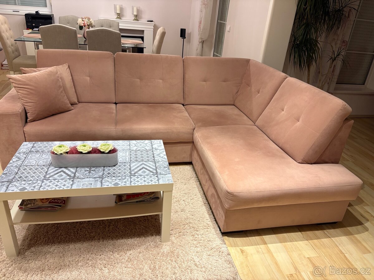 Prodám rohovou sedací soupravu ve starorůžové barvě, rozkládací s úložným prostorem o rozměru 246x183cm, výška 90cm.