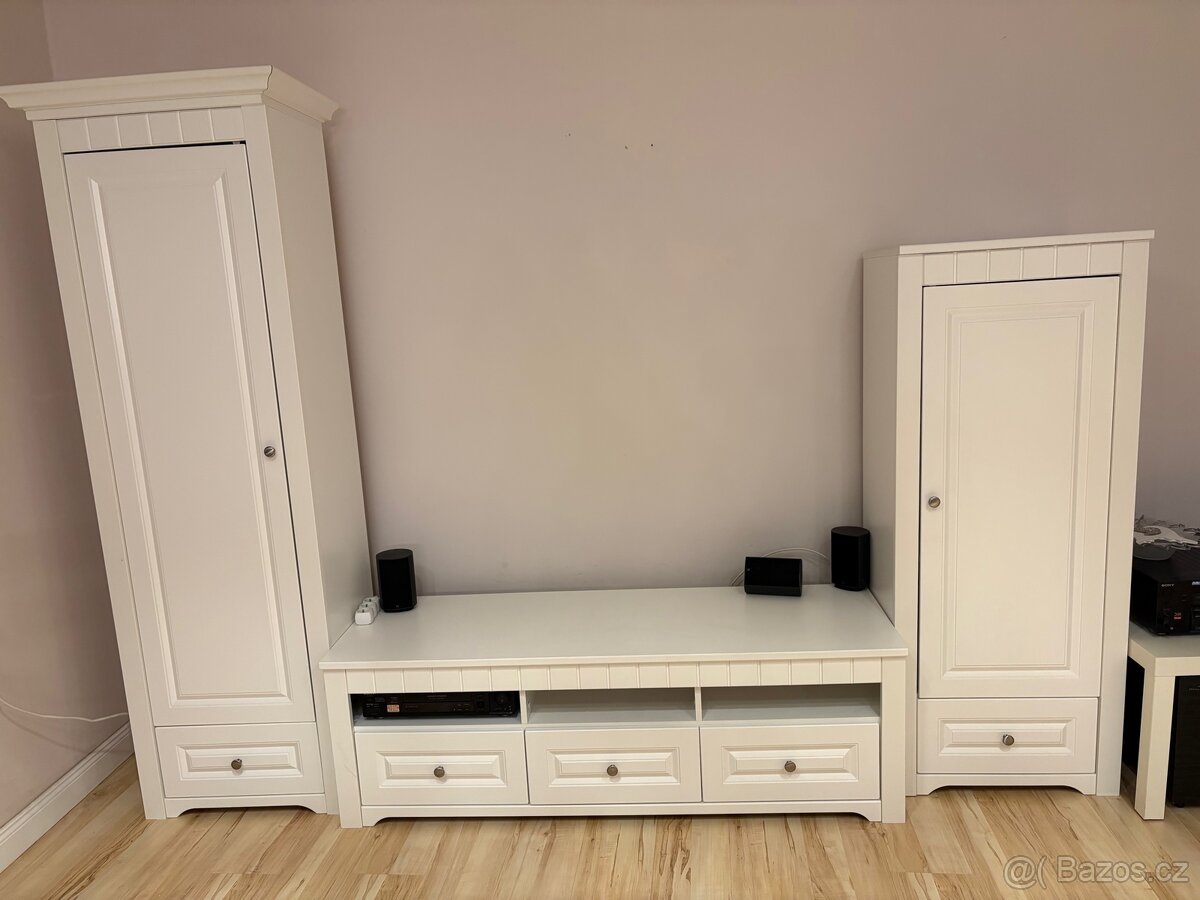 Prodám obývací stěnu bílé barvy složenou ze 3 samostatných skříní, rozměry d= 275cm, v =201cm komplet.