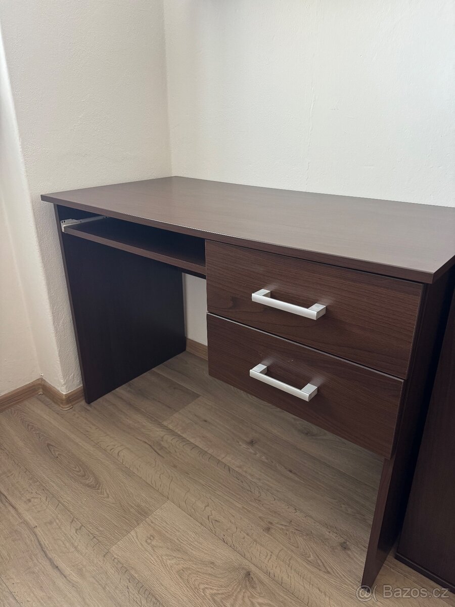 Psací stůl ve skvělém stavu, se šuplíky, tmavá barva dřeva.