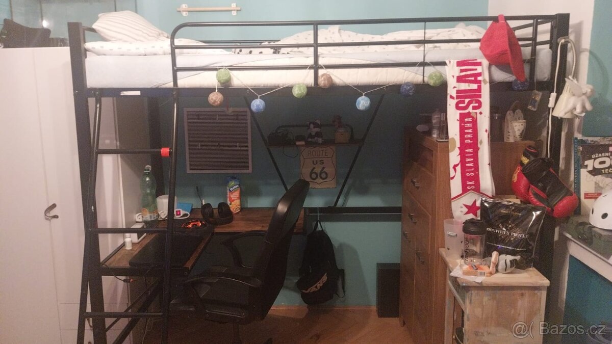 Prodám kovovou vysokou postel s psacím stolem a poličkou, pevná stabilní konstrukce, používaná rok, matrace 200x90 není součástí.