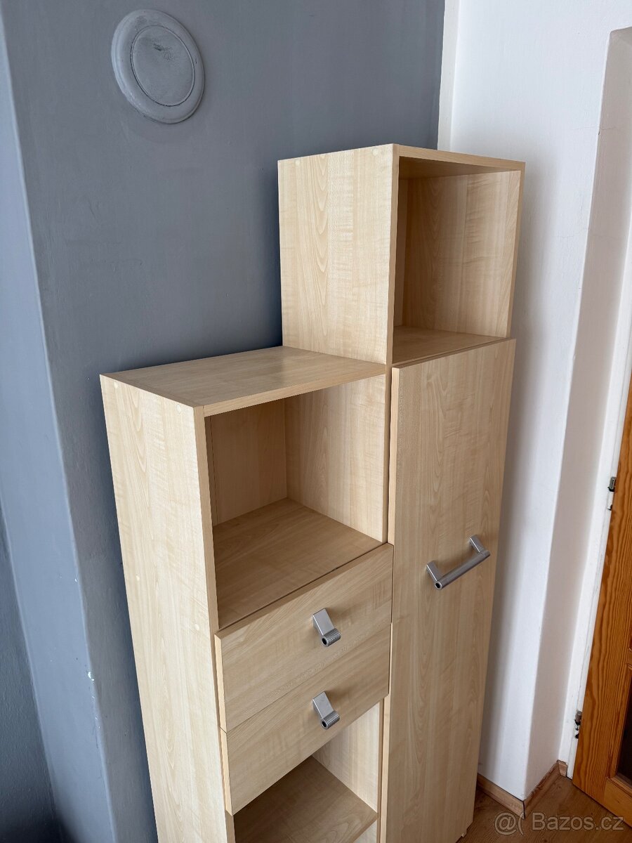 Prodám dvě tyto výstavní skříně. Mám k tomu další skříně, poličku a stoly ve stejném dekoru. Po dohodě mohu dovést dodávkou.