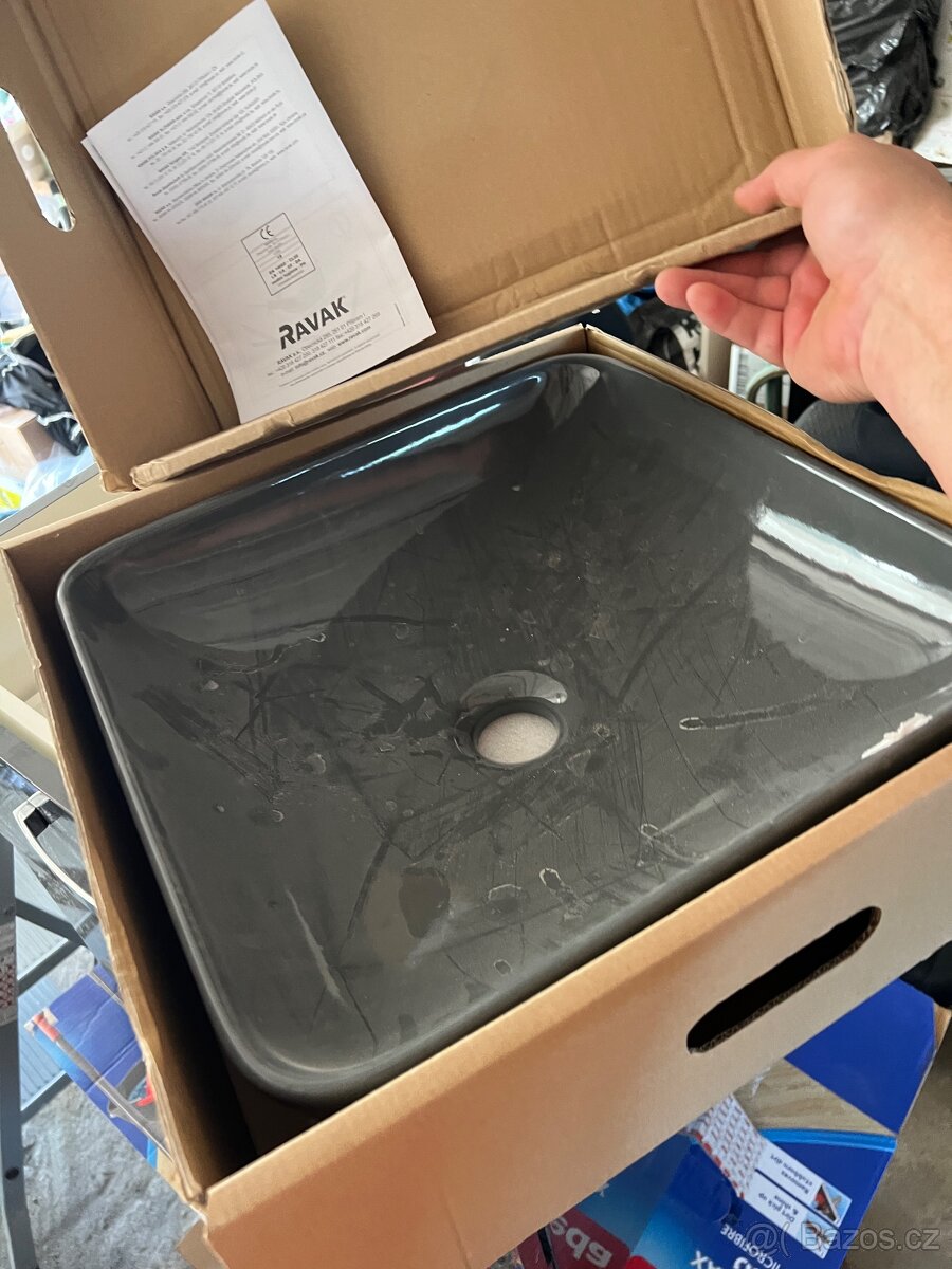 Umyvadlo Ravak jeden kus stejné barvy a vzhledu šedého lesku, umyvadlo je určeno na desku. Sestava byla koupena k instalaci s velkoformátovou kachlí 120x60. Nakonec jsme šli do jiné varianty. Vše je nové. Cena je za 2 kusy skříněk a jednoho umyvadla.