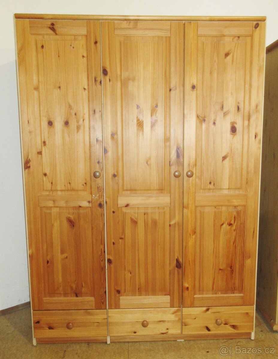 Borovicová šatní skříň se šuplíky - celomasiv - [20.2. 2026]Výborný stav.Rozměry V x Š x H: 196 cm X 109 cm X 57 cm. borovice nelakovaná...Možno rozmontovat. Klíč k dispozici. Kovové pojezdy. HEZCI NEZ NA FOTCE - nelakovaný nábytek se špatně fotí...Moznost dopravy na trase HK - Praha - Plzen ...v p ...