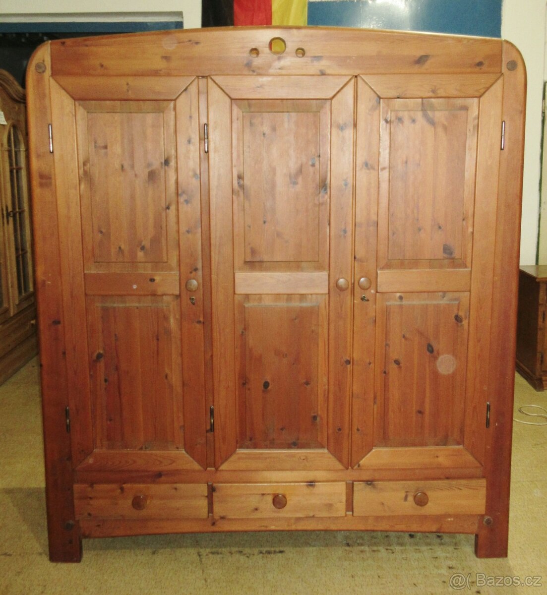 Výborný stav.Rozměry V x Š x H: 191 cm X 172 cm X 60 cm. borovice mořená - lakovaná - originál barva...Možno rozmontovat. Klíče k dispozici. HEZCI NEZ NA FOTCE...BILE FLEKY JSOU Z FOTAKU. Vyrobeno z 4 cm masivu...Moznost dopravy na trase HK - Praha - Plzen ...v pripade zajmu zaslete v emailu tel kontakt na Vas !!! Zajistujeme dopravu po cele CR přes přepravní firmu.