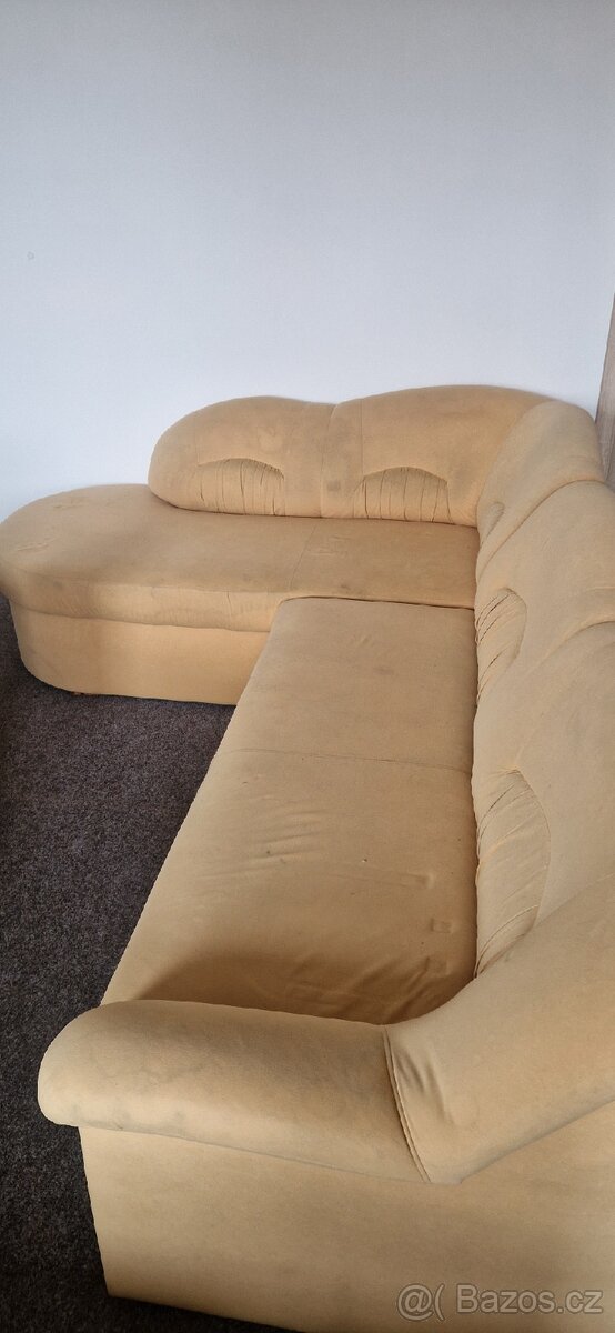Krásná sedací souprava - [1.3. 2026]Prodám velmi hezkou sedací soupravu, rozměry 275cm X 240cm. Lehce propadlá část, viz detail na fotce, vyřešili jsme to polštáři, které v případě zájmu přenechám, jinak nepoškozená. Lze rozložit.