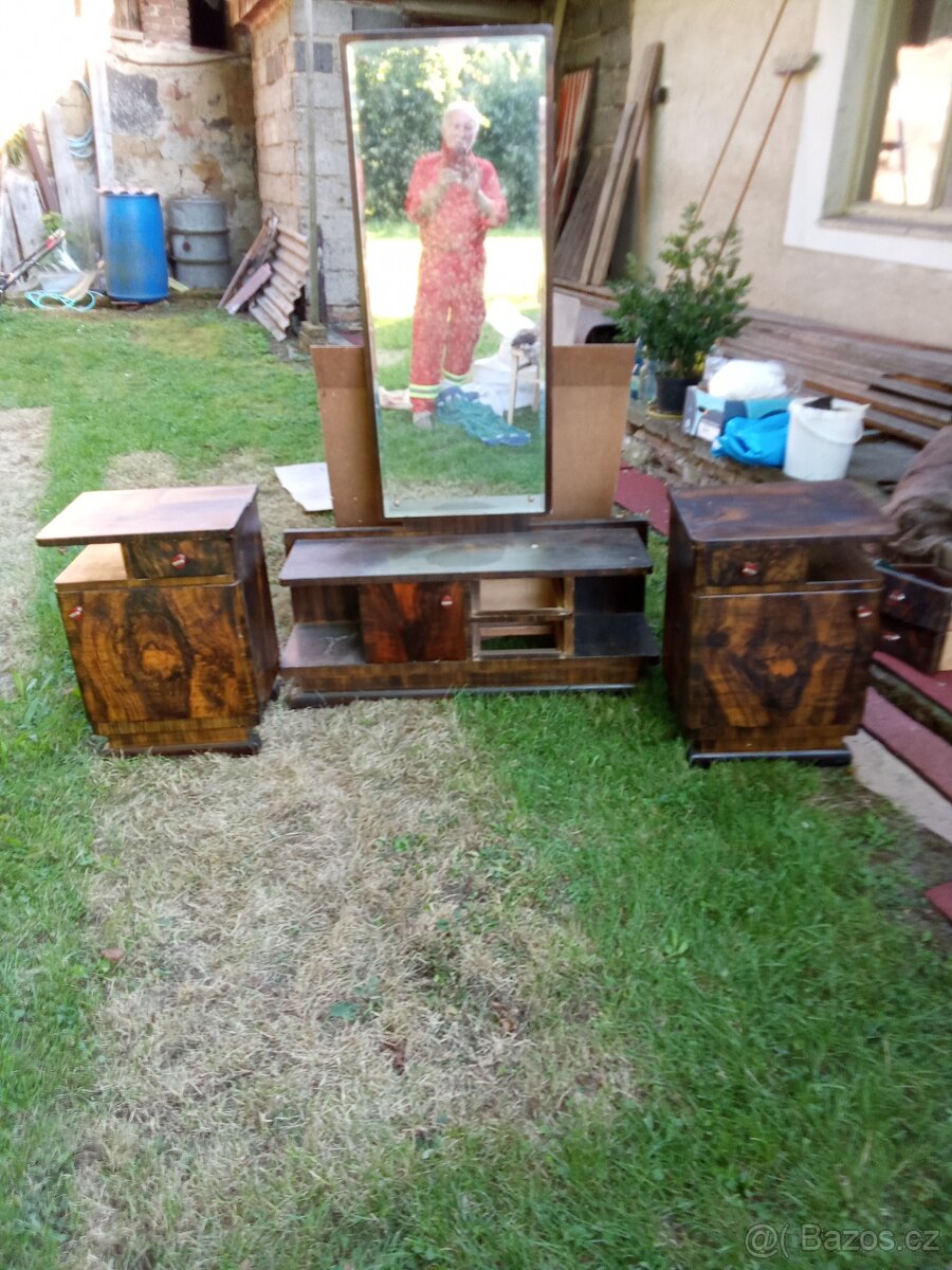 Retro set - 2 skříně + toaletní stolek – masiv, dýha - [10.1. 2026]Retro set nábytku z masivu z cca. 60. let. Jedná se o kvalitní a stabilní nábytek s krásnou, výraznou kresbou dýhy. Ideální pro milovníky funkcionalismu a retro stylu.
