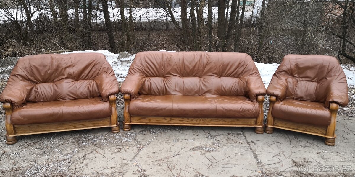 Prodám pěknou koženou sedací soupravu 3+2+1 s masivním dřevem. Rozměry: trojsedačka-190cm,dvojsedačka-140cm,křeslo-95cm,výška-95cm.
