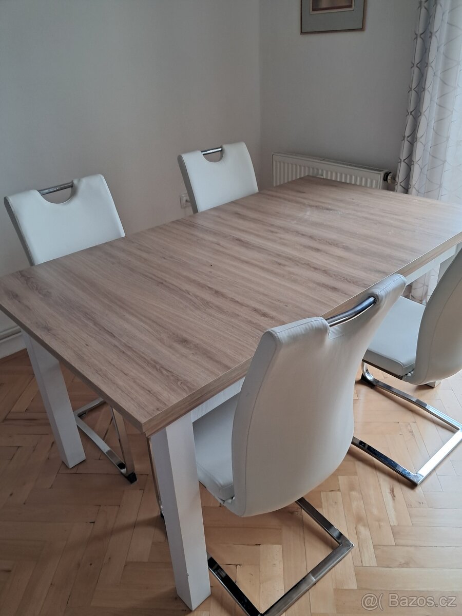 + téměř nové 4 židle, bílá koženka