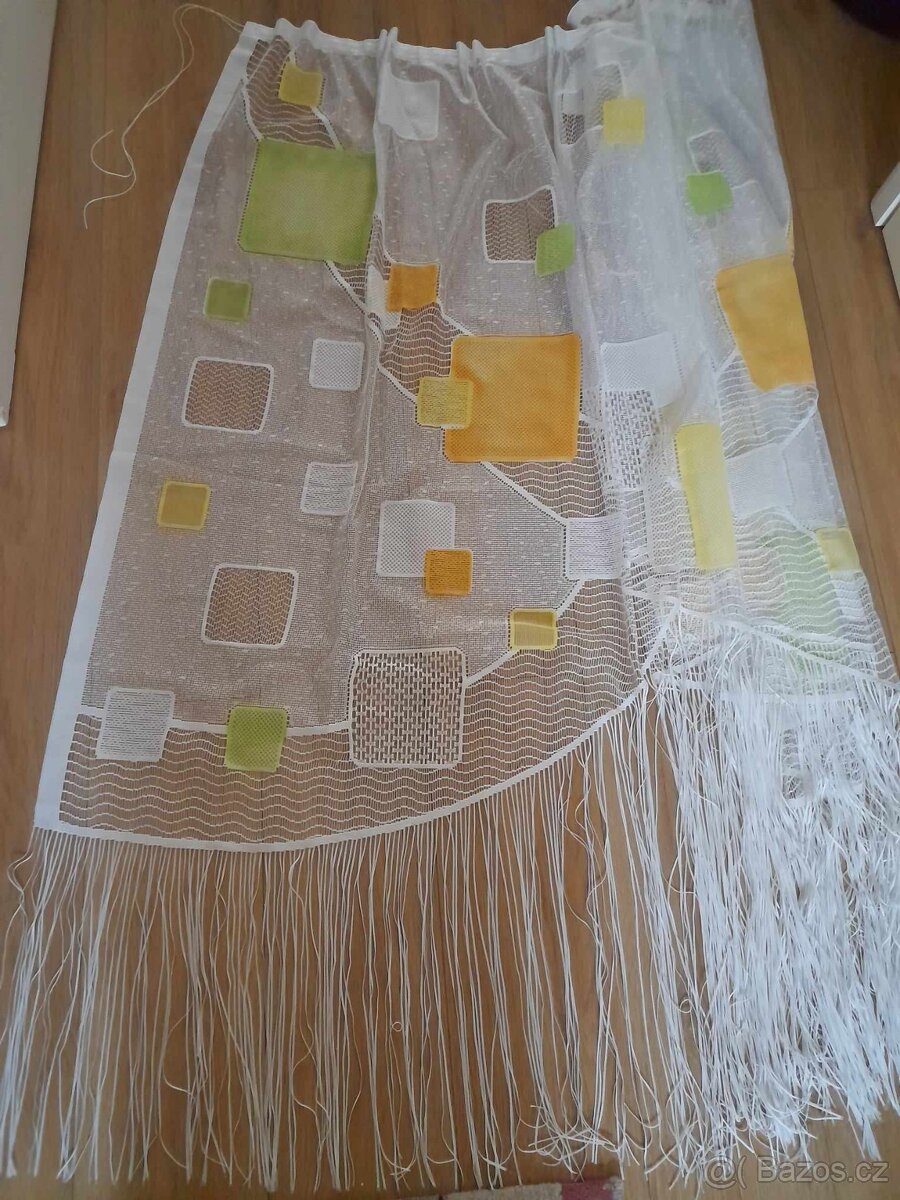 Velmi zajímavá záclona s barevným vzorem a třásněmi. Délka 150cm, šířka 3m. Je to kusovka s pevnými okraji a nahoře je obšitá řasící stužkou do dvojskladu, která ji pravidelně nařasuje. Záclona je jako nová (bílá barva je zcela v pořádku), střídaná na okně s jinými záclonami.