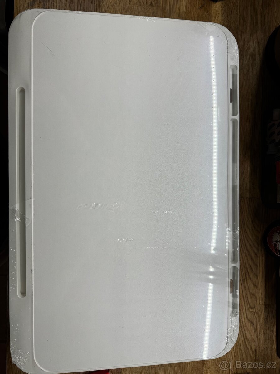 Nízký rozkládací stolek (do postele/ camping) z plastu, bílý. Plocha stolku 58x33cm, výška nožiček ca. 27cm. Balený ve fólii. Nový.