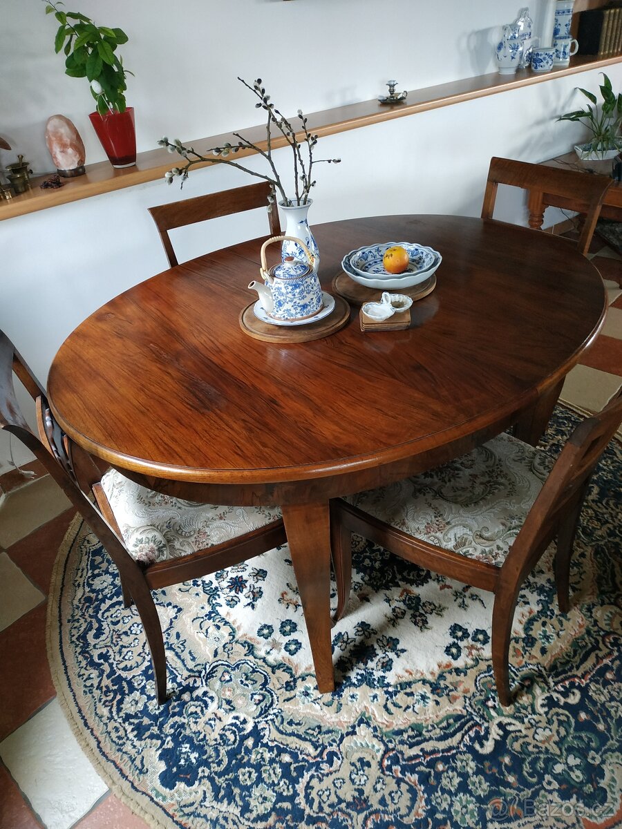 Prodám rozkládací oválný kuchyňský stůl + 4 čalouněné židle. Rozměr stolu je 110x140 cm, výška 77 cm, lze rozložit na 110x185 cm nebo 110x 230 cm